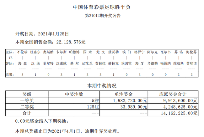 国米补时绝杀米兰北京时间1月28日,胜负彩第21012期开奖结果揭晓。本期一等奖开出5注,单注奖金1,982,720元;二等奖开出125注33,989元;任九开766注14,713元;本期胜负彩销量为22,128,576元,任九投注总额17,609,638元。
