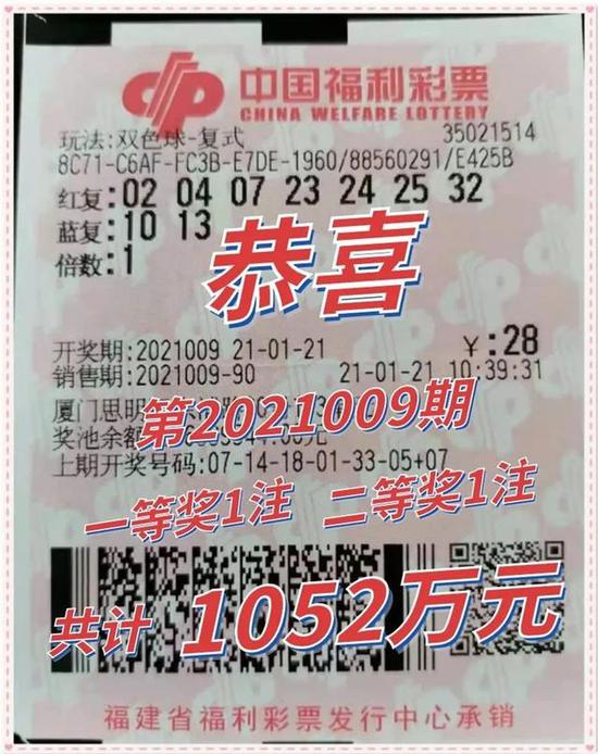 1月21日晚,中国福利彩票双色球第2021009期开奖,当晚全国共中出4注1000万元头奖,其中1注花落福建厦门。这位幸运彩民揽获双色球一等奖1注、二等奖1注,奖金共计为1052万元,该注大奖也是厦门在2021年的第一个千万元巨奖。