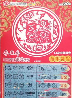 李先生购买福利彩票已有十余年,平时主要购买“双色球”“3D”电脑票玩法,有时也会买几张刮刮乐试试手气,曾经中到过的最大奖是1000元。1月26日,李先生照常前往福彩站点购彩,见刮刮乐销售柜中摆放着“辛丑牛”彩票,便掏出60元买了三张面值为20元的“辛丑牛-福牛贺岁”。