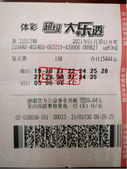 艾先生在1月30日购买了一张21013期的大乐透复式票,命中1注一等奖、4注二等奖和若干固定奖,单票总揽奖金1140万余元。
