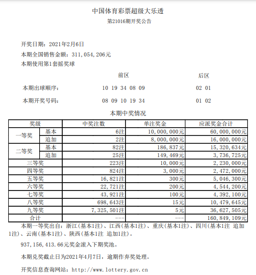 北京时间2月6日晚,体彩大乐透第21016期开奖,当期开奖号码为前区:08 09 10 19 34,后区01 02。本期一等奖开出6注,单注奖金1000万元,其中2注选择追加,多得奖金800万元。2注追加头奖分落2地,四川、陕西各1注;4注基本头奖分落4地,浙江、江西、重庆、云南各1注。二等奖开出82注,单注奖金18.6万元,其中25注选择追加,多得奖金14.9万元。本期大乐透销量为3.11亿元,计奖结束后奖池余额9.37亿元。