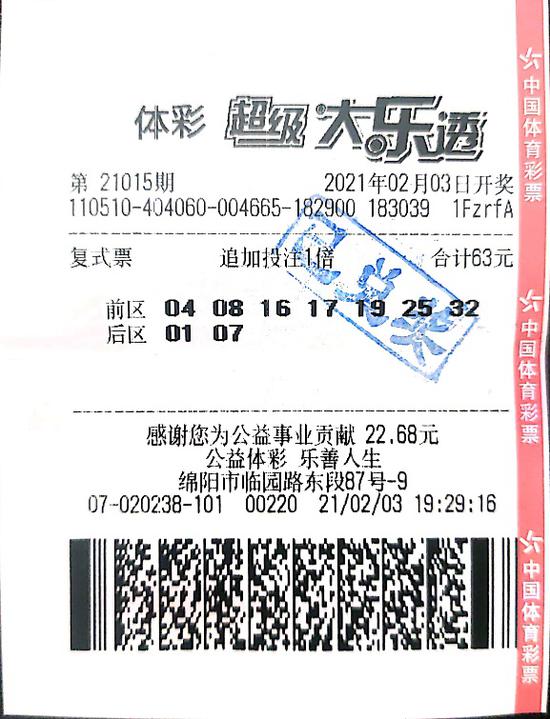 2月3日,在体彩大乐透第21015期开奖中,这位幸运的绵阳购彩者通过一张追加投注的“7+2”复式票命中1253万元奖金。中奖者介绍,这次选的几个号码都是平时比较熟悉的,中奖完全是靠运气。