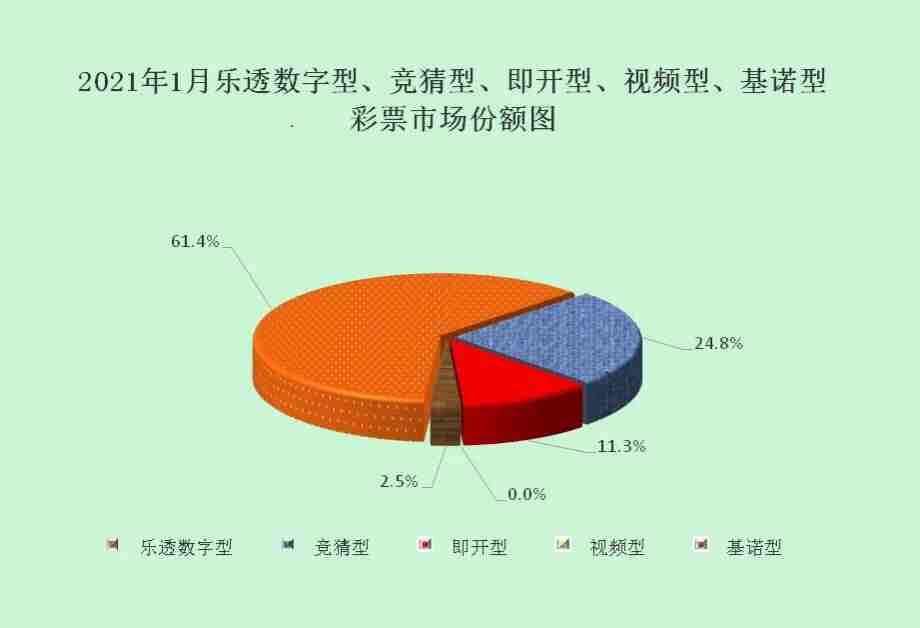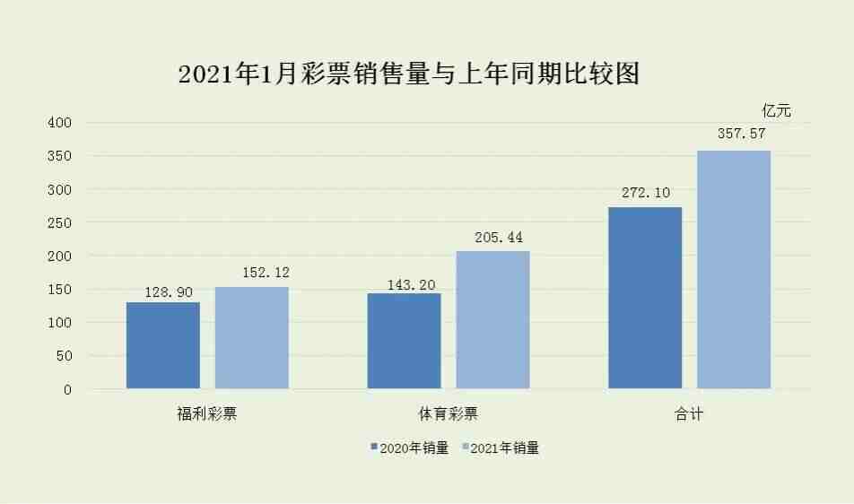 2月26日,财政部公布2021年1月份全国彩票销售情况,具体如下: 全国彩票销售情况 福彩152亿元 体彩205亿元 1月份,全国共销售彩票357.57亿元*,比上年同期(简称“同比”)增加85.47亿元,增长31.4%。其中,福利彩票机构销售152.12亿元,同比增加23.22亿元,增长18.0%;体育彩票机构销售205.44亿元,同比增加62.25亿元,增长43.5%。考虑到去年休市时间较长,1月份彩票销量同比增长较快。 分类型彩票销售情况 即开、基诺型游戏增长明显 1月份,乐透数字型彩票销售219.35亿元,同比增加69.66亿元,增长46.5%; 竞猜型彩票销售88.82亿元,同比增加20.78亿元,增长30.5%; 即开型彩票销售40.45亿元,同比增加12.68亿元,增长45.6%; 视频型彩票销售0.0019亿元,同比减少26.50亿元,下降100%; 基诺型彩票销售8.94亿元,同比增加8.85亿元,增长9050.1%。 1月份,乐透数字型、竞猜型、即开型、视频型、基诺型彩票销售量分别占彩票销售总量的61.4%、24.8%、11.3%、0.0%、2.5%。 分地区彩票销售情况 粤浙豫增加额较多 1月份,与上年同期相比,全国共有30个省份彩票销量增长,其中广东、浙江和河南增加额较多,同比分别增加11.69亿元、7.04亿元和5.40亿元。 各级彩票机构要密切跟踪分析新情况新问题,切实加强彩票发行销售工作,确保市场平稳运行。各级财政部门要进一步加强监管工作,积极创造良好的外部环境,维护市场正常秩序,促进彩票事业健康发展。 *备注:乐透数字型按照销售期结束时间统计销量;竞猜型彩票传统足球游戏和区域联网单场竞猜游戏按照销售期结束时间统计销量,竞猜型彩票全国联网单场竞猜游戏按照投注内容开奖时间统计销量;即开型彩票根据销售时间统计销量;视频型彩票根据销售时间统计销量;基诺型彩票按照销售期结束时间统计销量。