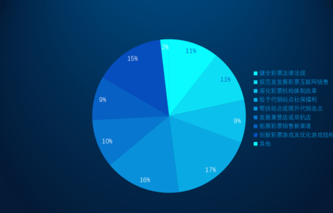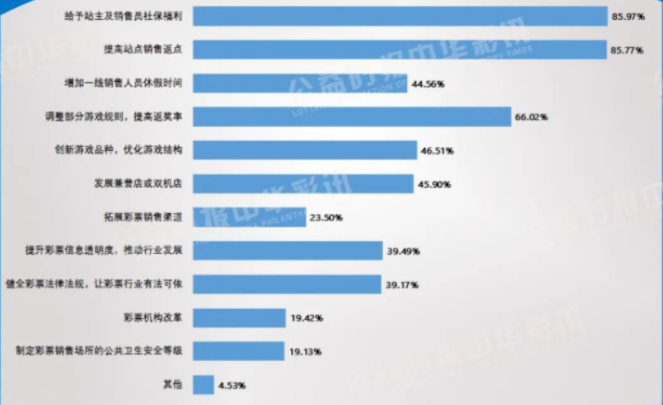 依据数据,“给予代销站点社保福利”、“帮扶站点或提升代销返点”、“创新彩票游戏机优化游戏结构”依次列位关注度前三。同时,针对相同话题彩票相关媒体《公益时报》所做调查呈现结果也基本一致。