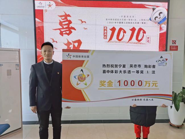 3月1日,我区吴忠市购彩者中得体彩大乐透21020期1000万元大奖得主,现身宁夏体育彩票管理中心兑奖。宁夏体育彩票管理中心副主任魏华为其颁奖。