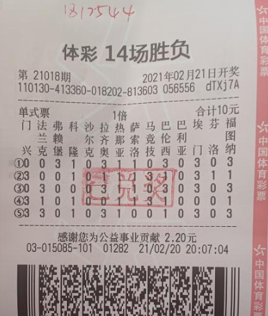 在传统足彩14场胜负游戏第21018期开奖中,洪先生通过一张5注号码、10元投入的单式票,中出1注181万元一等奖。