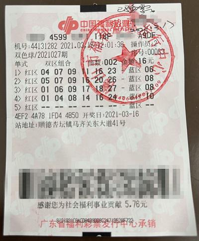 2021年3月16日晚,双色球第2021027期开奖,当期双色球红球号码为05、07、09、16、20、26,蓝球号码为08,当期全国一等奖遍地开花,开出23注,单注奖金5339305元,广东省中得3注,其中佛山市中得2注,由佛山市顺德区杏坛镇马齐关东大道41号第44131282号投注站中出。经检索,中奖彩票是一张2倍4注自选单式票,投注16元,共中出2注一等奖、2注六等奖,共揽获奖金10678620元。