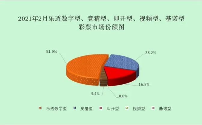 2月份,乐透数字型彩票销售98.39亿元,竞猜型彩票销售53.44亿元,即开型彩票销售31.29亿元,视频型彩票销售0.0009亿元,基诺型彩票销售6.43亿元。2月份,乐透数字型、竞猜型、即开型、视频型、基诺型彩票销售量分别占彩票销售总量的51.9%、28.2%、16.5%、0.0%、3.4%。