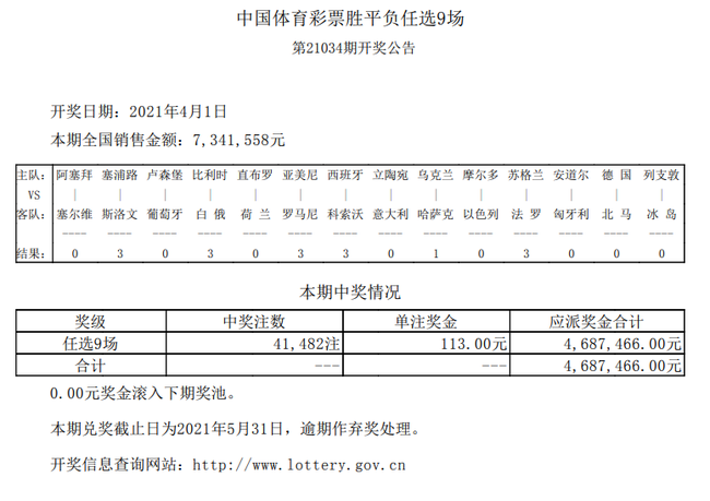 比利时8-0血洗白俄罗斯北京时间4月1日,足彩任选九第21034期开奖结果揭晓。本期任九开出41482注,单注奖金113元,投注总额为7,341,558元