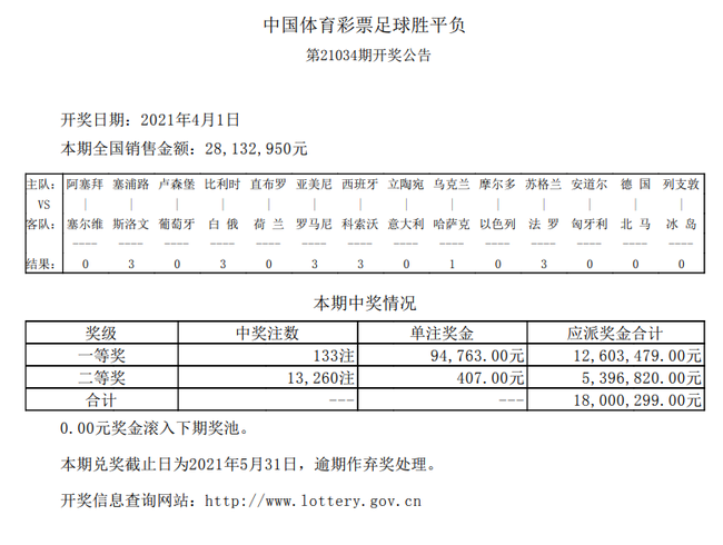 德国1-2马其顿北京时间4月1日,胜负彩第21034期开奖结果揭晓。本期一等奖开出133注,单注奖金9.45万余元;二等奖开出13260注,单注奖金407元。任九开出41482注,单注奖金113元。本期足彩14场投注总额为28,132,950元,任九投注总额为7,341,558元。