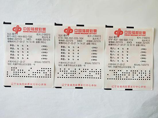 3月27日,福彩3D第2021076期开奖,当期开奖号码为:9 5 4,位于本溪市桓仁县的福彩210号投注站中出单选1163注,其中一位彩友仅凭两张彩票就中得990注单选,奖金共计1029600元。