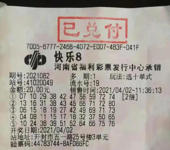 4月2日晚,福彩“快乐8”第2021082期开奖,开封市一彩民独揽2注“选十”头奖,为一张“选十”单式2倍20元票,出自开封市五一路41020049福彩投注站,总奖金10000004元,为全国首个“快乐8”1000万元大奖。