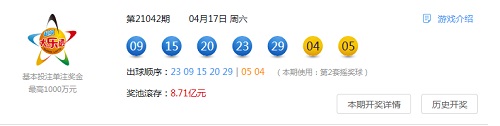 4月17日晚,超级大乐透第21042期开奖,也是超级大乐透10亿大派奖第4期开奖。本期前区开出号码“09、15、20、23、29”,后区开出号码“04、05”。本期全国销量为3.93亿元,为国家筹集彩票公益金1.41亿元。