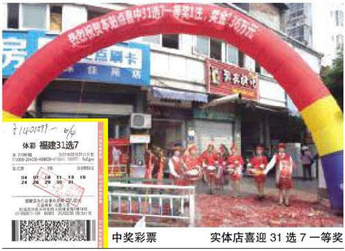 3月31日,福建31选7第21080期开奖,南平市松溪县河东乡河东桥头明珠家苑1楼14号50911实体店购彩者羊女士中得一等奖1注,奖金136万元。4月6日,中奖者羊女士现身福建省体育彩票管理中心领奖。