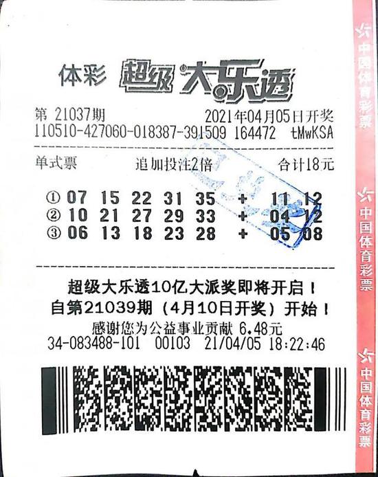 4月5日,体彩大乐透第21037期前区开出号码10、21、27、29、33,后区开出号码04、12。当期四川省凉山州一购彩者中出2注大乐透追加投注一等奖,中奖彩票为一张2倍,18元的单式倍投追加票,单票擒奖2913万元。
