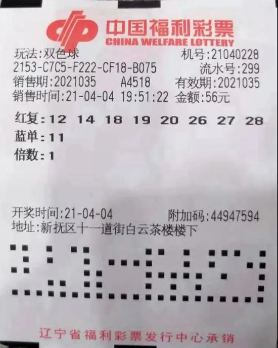 当期双色球头奖7注,其中1注大奖再次花落抚顺,中奖彩票出自位于新抚区十一道街白云茶楼楼下的福彩第21040228号投注站,购买时间为4月4日19时51分,是一张自选、8+1、56元红复式投注票,喜中1注一等奖、12注三等奖和15注四等奖,总奖金788万多元。