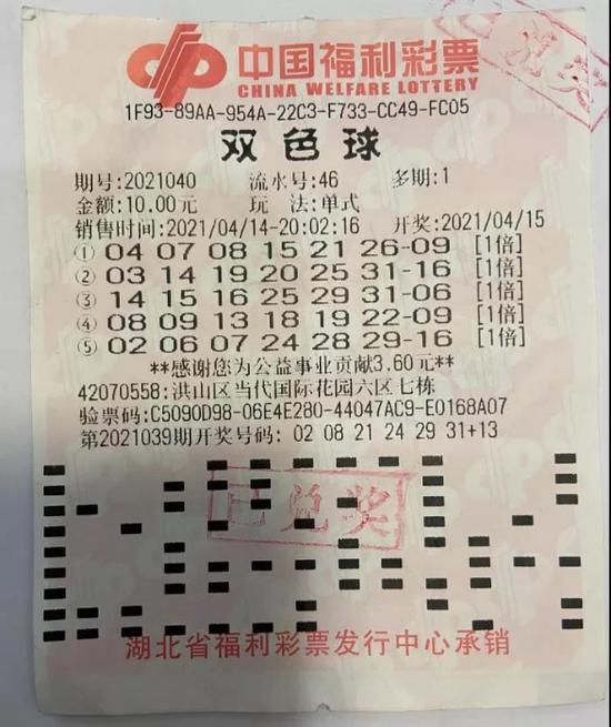 4月15日晚,双色球第2021040期开出02、06、07、24、28、29+16的大奖号。湖北省武汉洪山区一彩民,凭借一张10元的机选号,收获了一注一等奖,奖金865万元。