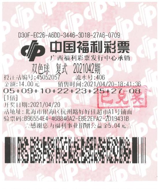 4月20日晚,中国福利彩票双色球游戏进行第2021042期开奖。当期双色球红球号码为05、09、10、22、25、27,蓝球号码为08。当期双色球头奖26注,单注奖金为549万多元,其中广西中出3注