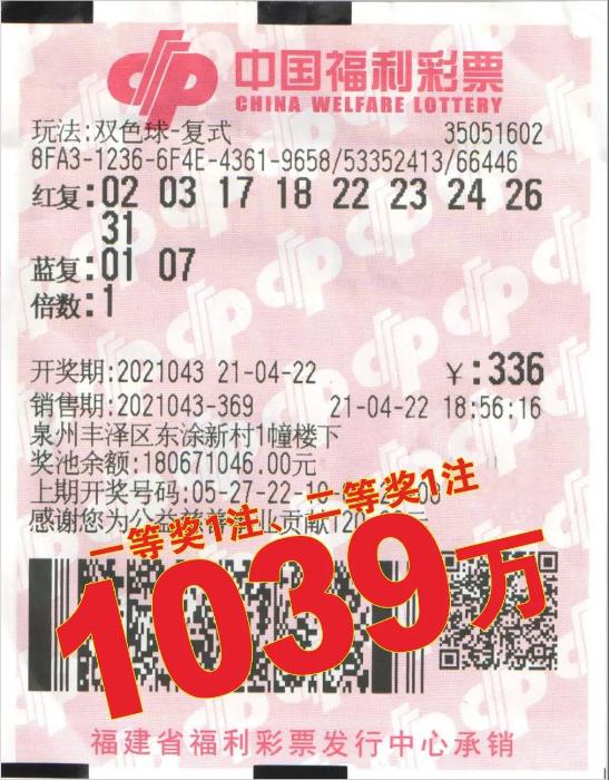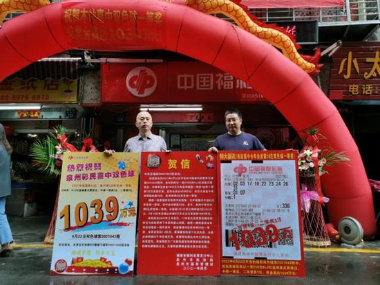 4月23日下午,在前一晚中得福彩双色球第2021043期1000万元超值一等奖的彩民来领奖了。这注一等奖出自泉州市丰泽区东涂新村1幢楼下的福彩35051602投注站,中奖彩票是一张9+2的机选复式票,中得1注超值一等奖、1注33万多元的二等奖和67250元的固定奖,总奖金高达1039万多元!
