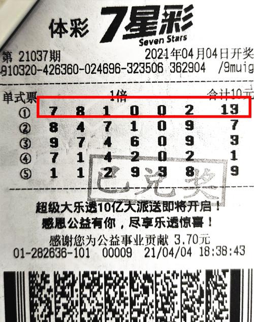 仔细查看钱先生带来的中奖票,是一张10元5注的单式票,4月4日购于南京3201282636体彩网点。票面第一注号码“7 8 1 0 0 2 + 13”,**命中7星彩第21037期开奖号码,中得一等奖1注,奖金500万元。谈及购彩经历,钱先生说,他彩龄有将近20年了,而且爱好比较广泛,不局限于一种玩法,7位数、大乐透都买过,基本上是看当天什么玩法开奖,就买什么。至于7星彩,钱先生还是刚刚入门。关于号码的选择,他都是自己选,有的时候会根据走势图修改。当天晚上开完奖,钱先生就查询到开奖号码,知道自己中了500万大奖。但是直到现在,他才现身领奖。对此,钱先生表示,“说实话知道自己中奖的第一天,是有点激动的,因为第一次中这么大的奖。但是第二天,我就恢复正常心态了,我觉得我自己还是比较淡定的。反正大奖就在那里,早领晚领,在我看来没什么差别。”