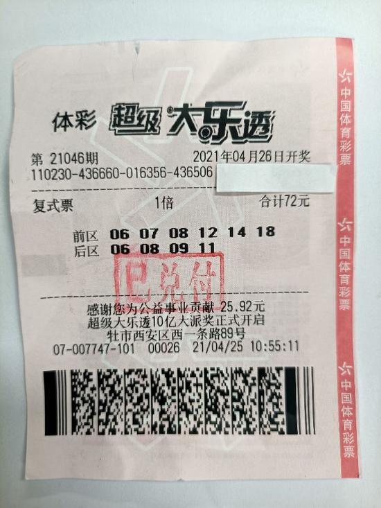 生活报讯 (记者杨镭文/摄) 26日,体彩超级大乐透第21046期开奖中,一注590余万元的基本投注头奖花落我省牡丹江市,由于中奖者采用“6+4”复式投注,这张彩票还中得4注二等奖以及若干固定奖,单票总奖金达到631万余元。27日,中奖者小满(化名)现身黑龙江省体彩中心领奖时表示,对于没有追加投注、错过追加奖金和大乐透10亿大派奖活动的派奖奖金,多少有些遗憾。