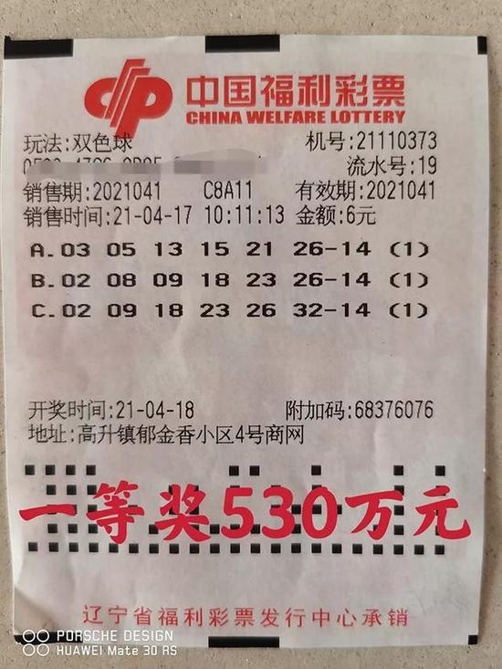 4月18日晚,双色球第2021041期开奖,全国共开出54注一等奖,两注花落辽宁。令人欣喜的是,其中的一注出自盘锦。开出大奖的是位于盘锦市高升镇郁金香小区的福彩第373号投注站。这注彩票购买时间为4月17日上午10点多,中奖彩票为一张自选单式投注票,共3注,仅6元钱,分别中了一等奖、三等奖和六等奖,奖金累计高达531万元。
