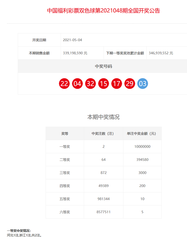 22:10 本期头奖开出2注,单注奖金1000万分落河北、浙江。二等奖开出64注,单注奖金39.4万多元。本期双色球销量为3.39亿元,计奖结束后奖池余额升至3.46亿元。