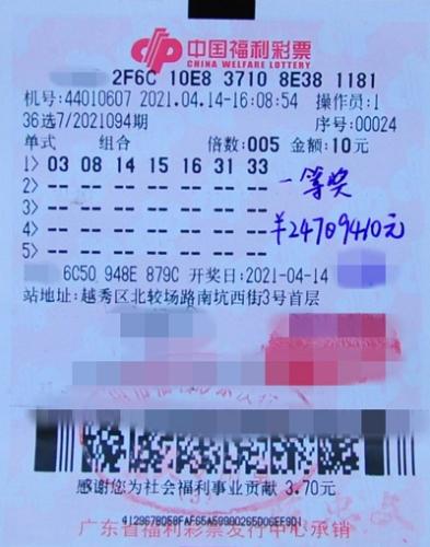 4月14日晚,南粤风采“36选7”游戏进行第2021094期开奖,开出的基本号码为“03、08、14、15、31、33”,特别号码为“16”。当期广东省共开出5注一等奖,单注奖金为494万多元。经检索,这5注一等奖全部花落广州市,由越秀区北较场路南坑西街3号首层的44010607站中得。开奖后,已遭遇“头奖荒”近半年的南粤风采游戏奖池一夜被掏空。
