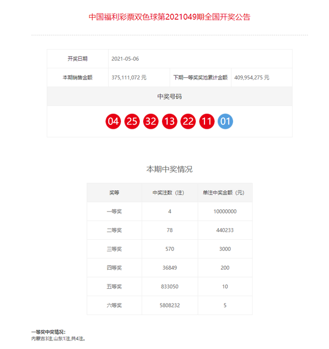 22:20 本期头奖开出4注,单注奖金1000万分落2地,其中内蒙古揽得3注,山东中出1注。二等奖开出78注,单注奖金44万元。本期双色球销量为3.75亿元,计奖结束后奖池余额4.09亿元。