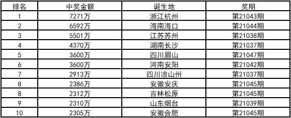 第21044期,海南海口一购彩者通过一张经30元投入的单式追加倍投票,揽下5注1318万余元一等奖,单票收获奖金6592万元。中奖者马先生是大乐透的忠实购彩者,那天他和几位朋友吃晚饭,路过体彩店,便进去机选了2注大乐透。凌晨0时左右,他在手机上查看了当期大乐透的开奖号码,一核对自己买的彩票,发现其中一注和开奖号码一模一样。