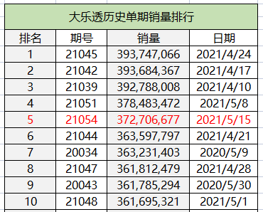 北京时间5月15日晚,体彩大乐透第21054期开奖,同时本期也是大乐透10亿大派奖的第16期。当期开奖号码为:前区03 06 17 20 25,后区03 09。随着派奖活动的持续进行以及上期亿元奖的爆出,彩民的参与热情也不断提高,本期大乐透销量达到3.72亿多元,位列大乐透历史单期销量排行第5名!