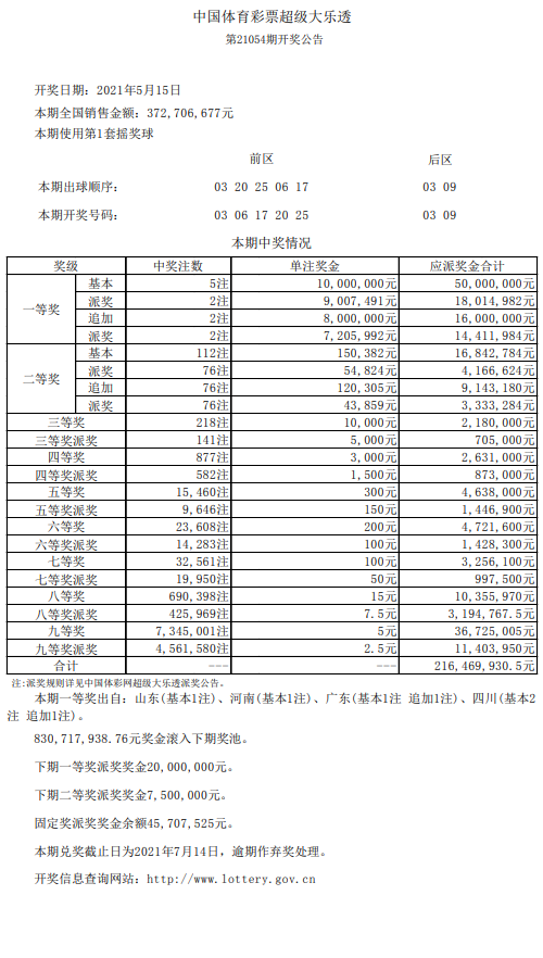 本期开出5注一等奖,其中2注为追加投注,单注奖金3421万(基本奖1000万+派奖900万+追加奖金800万+追加派奖720万),其中广东、四川各中得1注追加头奖。3注基本头奖,单注奖金1000万元,分落山东、河南、四川。