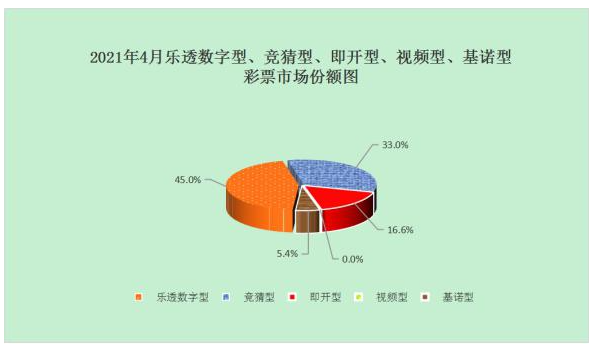 4月份,乐透数字型彩票销售131.06亿元,竞猜型彩票销售95.97亿元,即开型彩票销售48.40亿元,视频型彩票销售0.0008亿元,基诺型彩票销售15.59亿元。4月份,乐透数字型、竞猜型、即开型、视频型、基诺型彩票销售量分别占彩票销售总量的45.0%、33.0%、16.6%、0.0%、5.4%。