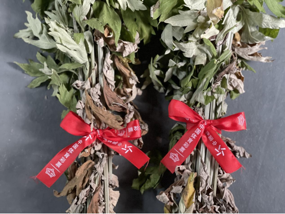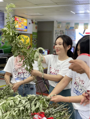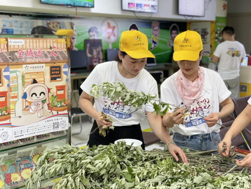 经过数小时的辛勤劳作,业主们将采来的艾草运回体彩店内,精心挑选,分批捆扎成束,缕缕艾香弥漫,一扫燥热与疲惫。大家分工协作,你剪枝来我扎彩,一条条“中国体育彩票”红丝带缠绕在艾草上,期待将艾草送到市民手中的那一刻,传递体彩人的浓浓祝福与“艾”意。