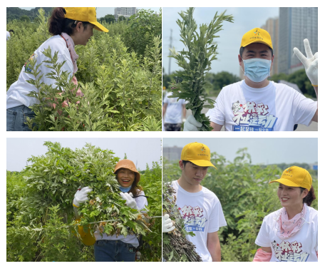 6月9日一大早,22位体彩销售业主们组成整齐的车队,驱车来到武汉郊区亲手采割新鲜艾草。刚下车,映入眼帘的一大片野生艾草,让大家瞬间兴奋起来,大家纷纷戴上手套拿起工具跨进艾草丛中开始采割。炎热的天气丝毫没有影响大家的热情,虽然汗珠挂在脸颊,但是嘴角微笑上扬,艾香沁入心脾,拂去了炎热与疲惫。久违的烈日下劳作,虽然一时难以适应,但大家一直互相聊天互相鼓劲,谈笑风生间,艾草倒了一片片。