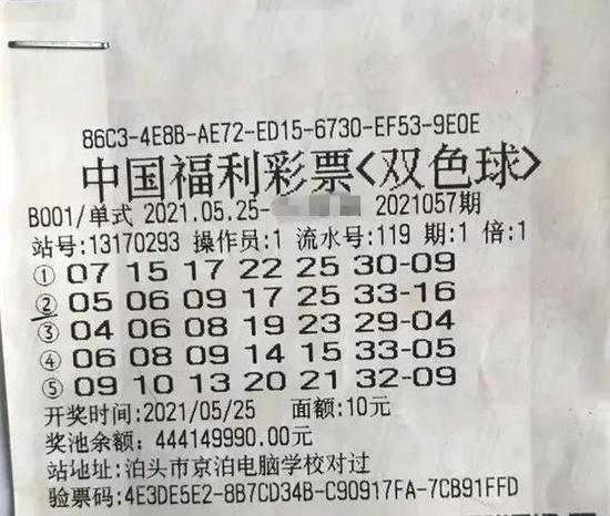 5月25日,双色球第2021057期开奖,河北泊头市京泊电脑学校对面13170293号福彩站购彩者陶先生(化姓)凭借一张10元5注单式票中得一等奖1注,单注奖金888.285万元。