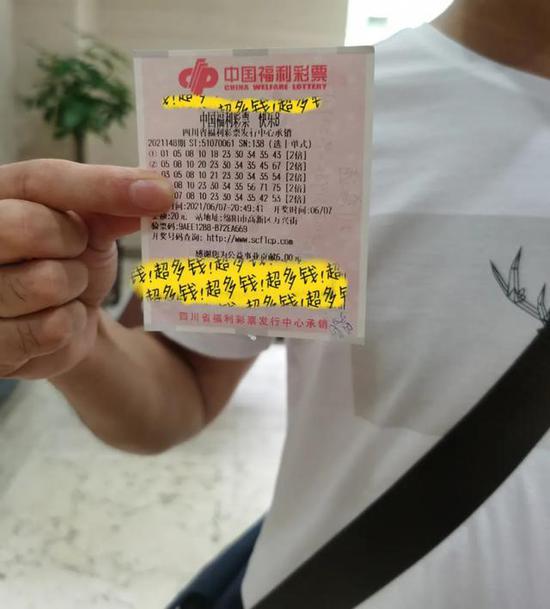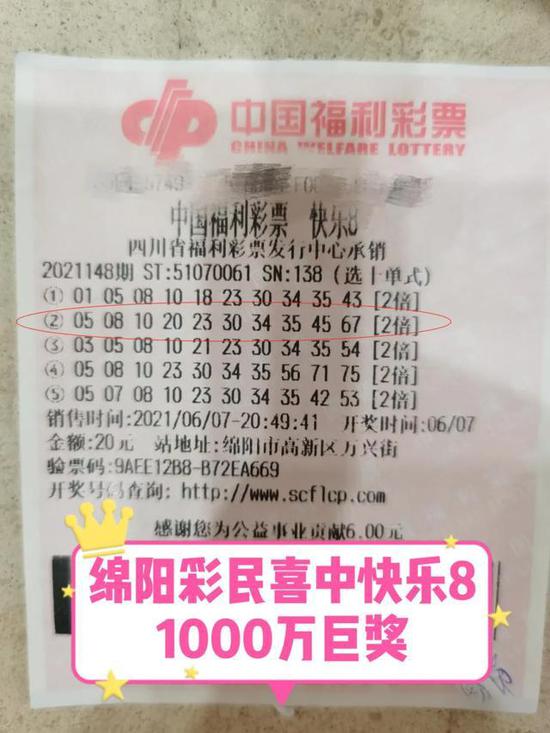 6月7日晚,快乐8游戏第2021148期开奖,全国仅四川中出2注“选十中十”大奖,花落绵阳市高新区万兴街12号,福彩51070061号站,据检索,该票是一张2倍投注的“选十”玩法单式票,奖金合计1000万元整!下午,小编在兑奖大厅见到了这位中奖彩民。他略显疲惫,肩背挎包,胸前抱着一沓资料。他说:“昨晚知道中奖后兴奋得整晚没睡着,今天一早就去单位处理完事情后便匆忙赶来成都兑奖,感觉现在都还没有缓过神来”。