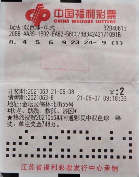 6月8日晚,中国福利彩票双色球游戏进行第2021063期开奖。当期双色球红球号码为04、05、06、09、23、24,蓝球号码为09。当期双色球头奖开出16注,花落11个省份,单注奖金为500万元。其中,我省中得的1注头奖被常州彩民收入囊中。幸运站点为常州市金坛区儒林北街55号、编号32040615福彩投注站,出票时间为6月7日09时18分39秒。该幸运彩民仅花费了2元即命中一等奖,一举收获了500万元奖金。由于江苏福彩正在开展双色球感恩回馈月活动,一等奖单注派奖奖金高达300万元,因此一举收获了800万元奖金。