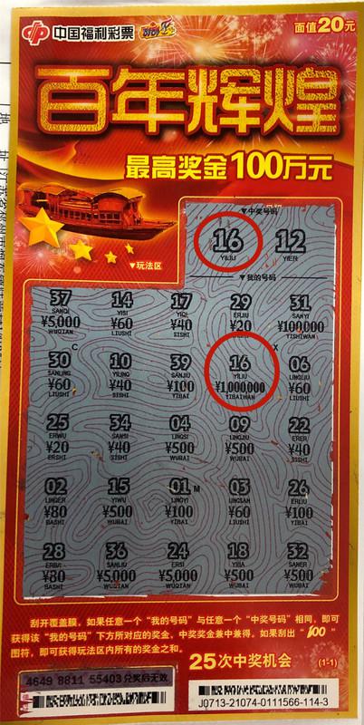 近日,昆山一购彩者陆先生刮出即开票“百年辉煌”头奖100万元,中奖彩票出自昆山市千灯镇景唐北路32053808站点。