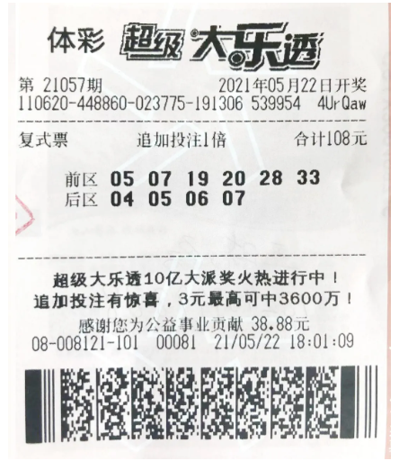 5月22日,在体彩大乐透第21057期开奖中,康先生通过一张6+4复式追加票,中出1注1015万元一等奖及小奖一连串,单票收获奖金1055万元。