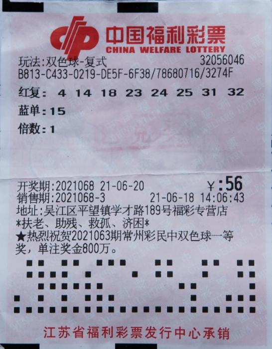 6月20日晚,中国福利彩票双色球游戏进行第2021068期开奖。当期双色球红球号码为04、14、18、24、31、32,蓝球号码为15。我省喜中的1注一等奖的幸运彩民来自于苏州市,幸运站点是苏州市吴江区平望镇学才路189号福彩专营店,编号为32056046,购彩时间为2021年6月18日14时06分43秒。该彩民花费56元,用一张“8+1”红球复式票中得一等奖。除了中出1注一等奖,还中出12注三等奖、15注四等奖。