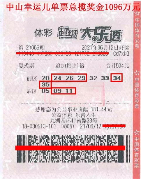 中山体彩中心主任张文建为幸运儿颁奖6月12日晚,大乐透第21066期开奖,全国共中出12注一等奖,其中1注追加投注一等奖花落中山,该中奖彩票同时还收获了2注追加二等奖和若干固定奖,总揽奖金1096万多元,为中山贡献税收218万元。