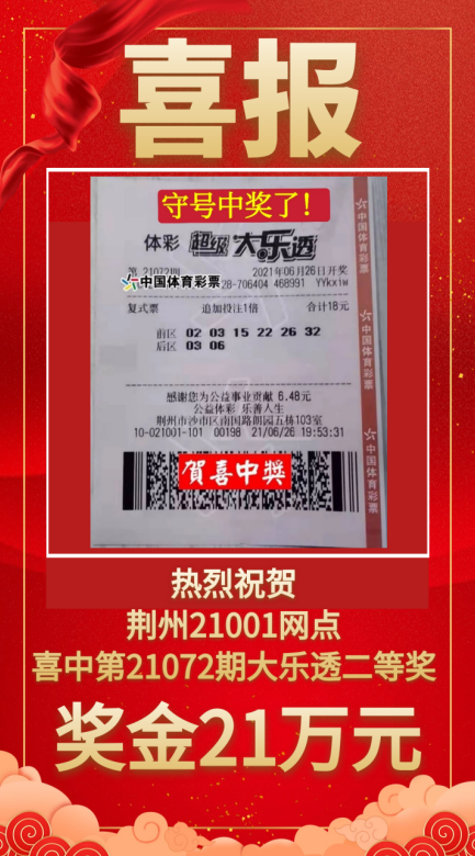 6月26日,体彩大乐透第21072期开出奖号“02、03、15、22、26+03、11”,全国共开出3注一等奖,我省荆州市沙市区21001体彩销售点喜中追加二等奖1注,幸运购彩者收获奖金21万余元。