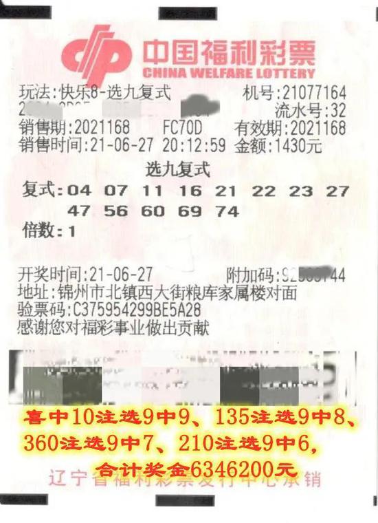 辽宁的大奖花落锦州,出自福彩第164号投注站,位于锦州市北镇西大街粮库家属楼对面,购买时间为6月27日20:12:59。中奖彩票为一张1430元的自选13个号码复式投注票,合计中奖6,346,200元。这是锦州彩友今年第三位中得百万元以上大奖。6月29日上午,中奖彩友来到市福彩中心办理了兑奖手续。据了解,他是位老彩友,购买福利彩票近20年,所有玩法均有涉及。自从快乐8上市以来,通过福彩宣传介绍,他了解到了快乐8的乐趣,开始研究号码及投注方式,每次都是自选十几个号码复式投注。