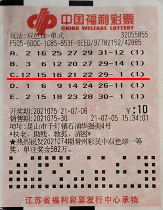 7月6日晚,中国福利彩票双色球游戏进行第2021075期开奖。当期双色球红球号码为12、15、16、21、22、29,蓝球号码为01。当期双色球头奖开出2注,单注奖金为1000万元。这2注一等奖花落2地:江苏1注、陕西1注。江苏省喜中的1注一等奖来自于苏州昆山,出票地址是昆山市千灯镇石浦华强街4号,第32055855销售网点,销售日期是7月5日15时34分01秒,这是一张机选5注单式票,花费10元,其中第3注号码与当期的中奖号码完全一致,喜获奖金1000万元,展现了双色球玩法“2元可中1000万元”的独特魅力。