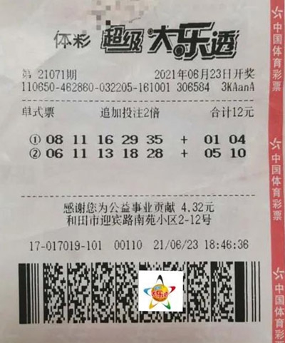 6月23日,在体彩大乐透第21071期开奖中,刘先生通过一张经2倍投的、2注号码、12元投入的单式追加倍投票,中出2注1131万余元一等奖,单票收获奖金2263万元。