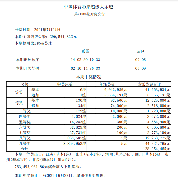 北京时间7月24日晚,体彩大乐透第21084期开奖。当期开奖号码为:前区02 10 14 30 33,后区06 09。