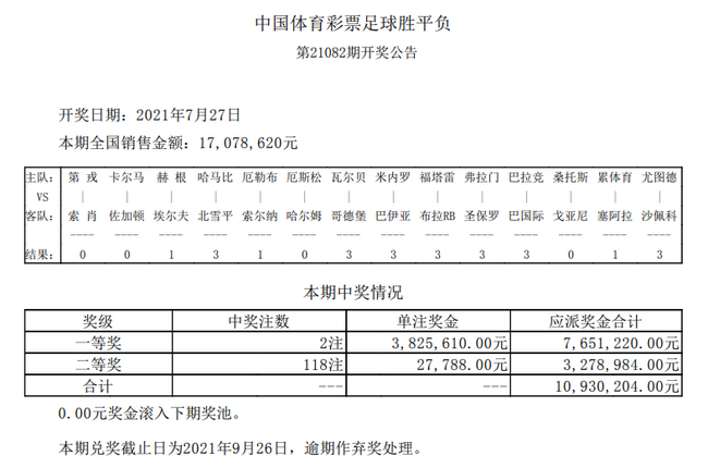 桑托斯主场0-1不输球造4.6倍冷负北京时间7月27日,胜负彩第21082期开奖结果揭晓。本期一等奖仅开2注,单注奖金382万余元,二等奖开118注,单注奖金2.7万余元;任九头奖则开393注1.9万余元。本期胜负彩销量为17,078,620元,任九投注总额11,838,790元。