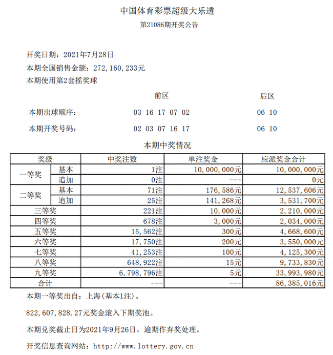北京时间7月28日晚,体彩大乐透第21086期开奖。当期开奖号码为:前区02 03 07 16 17,后区06 10。