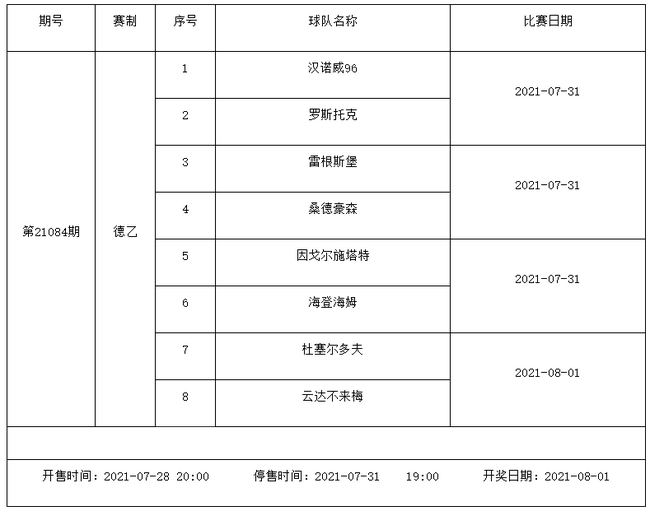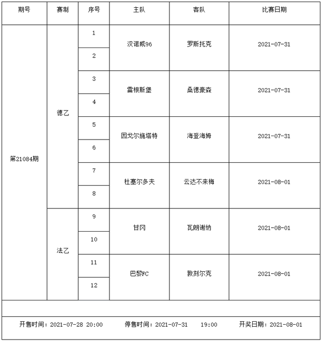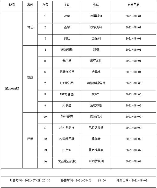足彩赛程北京时间2021年7月27日,国家体彩中心公布了2021年7月30日-8月5日的足彩赛程。其中7月31日(周六)、8月1日(周日)有足彩停售。7月31日的第21084期足彩由德乙、法乙、瑞典超组成;8月1日的第21085期足彩由德乙、瑞典超、巴甲组成,2期足彩的14场、6场半全场和4场进球玩法竞猜均为19点停售。
